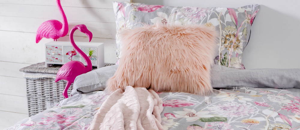Kolorowe kwiaty można odnaleźć nie tylko na polnej łące i rajskim wybrzeżu, ale także na… pościeli o akwarelowych barwach. Uszyta z najlepszego gatunku bawełny, elegancki wygląd zyskuje dzięki satynowemu splotowi. Funkcję szafki nocnej mogą pełnić wiklinowe kosze lub białe szafki z urokliwymi napisami, drobiazgi schowamy zaś w szkatułce lub niewielkiej szafce z szufladkami – w egzotycznej aranżacji sprawdzą się te zdobione rysunkami flamingów. Obowiązkowym dodatkiem sypialni są fantazyjne figurki oraz poszewki na poduszki zdobione tropikalnymi kwiatami lub wykonane z ekologicznego futra o długim i wyjątkowo miękkim włosiu.